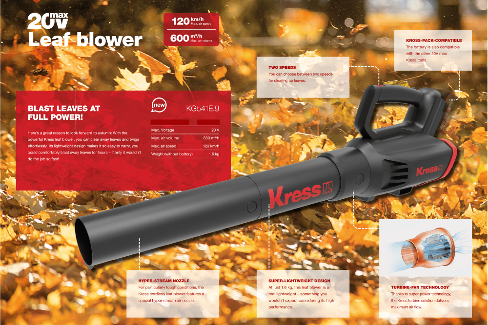 With the powerful Kress leaf blower, you can clear away leaves and twigs effortlessly. Its lightweight design makes it so easy to carry, you could comfortably blast away leaves for hours - if only it wouldn't do the job so fast!