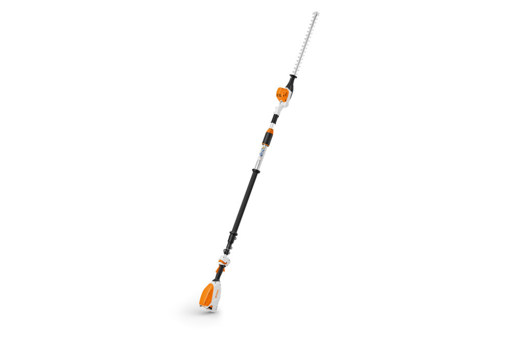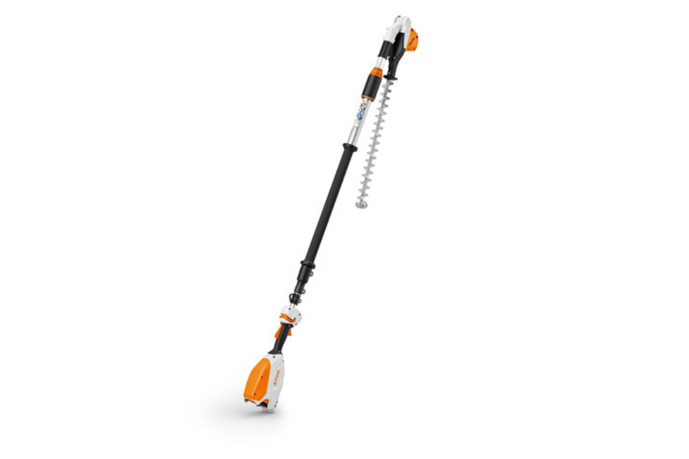 Cordless long-reach hedge trimmer with significant range for professional use. Particularly well-suited for pruning tall hedges and shrubs as well as cutting back plants close to the ground. Ergonomic work due to a stable square-cut telescopic shaft. Both the shaft length and cutter bar can be adjusted tool-free. The cutter bar can be pivoted through 115° for head height, side, and ground-level cutting. Double-sided cutting plate for a clean cutting pattern, infinitely variable speed control, and intuitive control handle. Transport length with cutter bar folded up 180 cm; total length 260–330 cm.